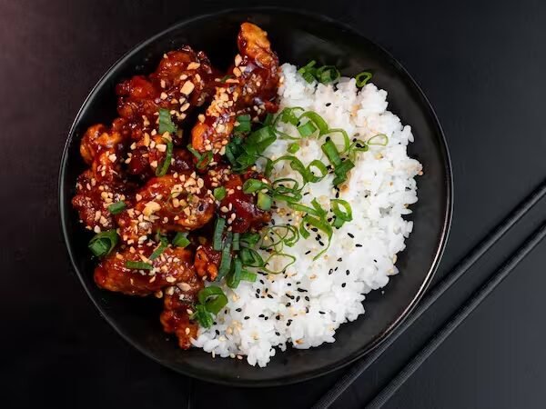 Frango frito coreano apimentado com gotchujang (pimenta típica coreana), acompanhando arroz oriental (gohan) e finalizado com cebolinha e amendoim.