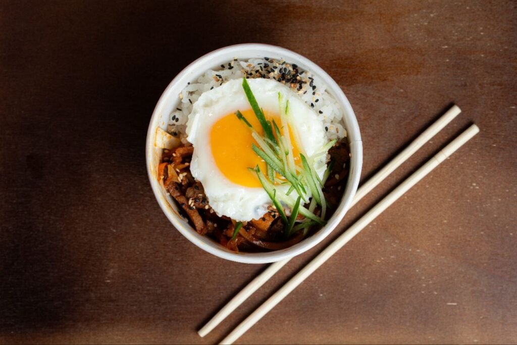 Barriga de porco picante servida com bap (arroz oriental), folhas de alface e uma porção de kimchi.